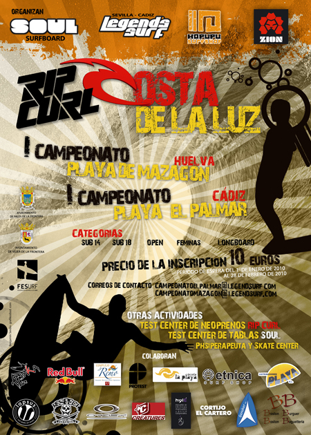 Este Domingo 7 de marzo del 2010, se ha celebrado en la playa de MAZAGÓN (HUELVA), la primera prueba del RIP CURL COSTA DE LA LUZ, evento patrocinado por esta marca fomentando el surf en la zona andaluza. Destacamos la participación de JAVI ARAGON e IGNACIO TOUZON, segundo y tercero en la clasificación SUB 14 y por otra parte MANUEL CEBADA, primer clasificado en la categoría OPEN, la participación chiclanera se hace notar en esta primera prueba, ahora queda jugar en casa y esperar buenos resultados.